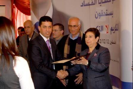 حيث قامت د. حنان عشراوي رئيسة لجنة المحكمين بتسليم الشهادة للسيد أسامة حرز الله نائب المدير العام للبنك الوطني ممثلاً عن السيد طلال ناصر الدين رئيس مجلس الإدارة.