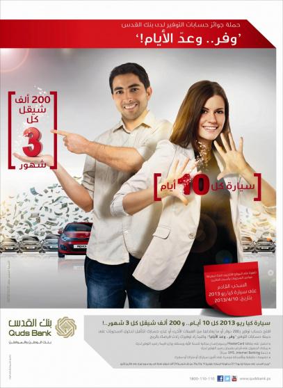 أعلن بنك القدس اليوم عن إطلاق أكبر حملة جوائز لحسابات التوفير في فلسطين، والتي تتضمن السحب على سيارة نوع Kia Rio 2013 مدفوعة الجمارك كل عشرة أيام و 200 ألف شيقل كل 3 شهور.