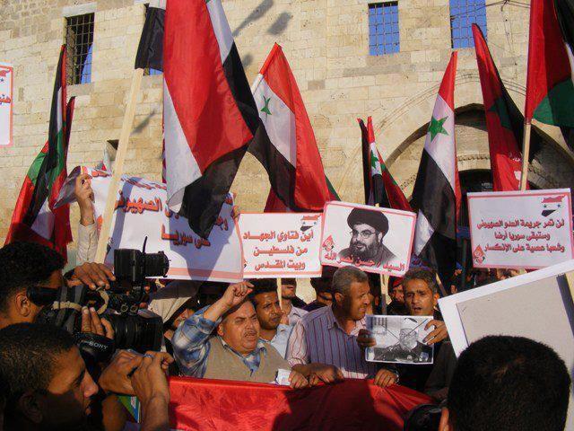 ورفع المشاركون في المسيرة صورة الأمين العام لحزب الله حسن نصر الله، فيما أكد مصدر مسئول في الجبهة الشعبية أنه لم توجد أي صورة للرئيس السوري بشار الأسد.