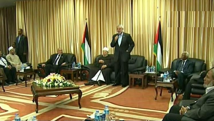 وقال هنية في كلمته خلال مراسم استقبال القرضاوي ووفد العلماء المرافق له ، إن القرضاوي "هو شيخ القدس والجهاد على أرض فلسطين ولم يدخل إلى قطاع غزة بإذن أو تصريح صهيوني ".