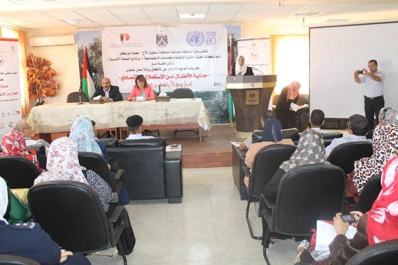 تحت رعاية محافظ سلفيت عصام ابو بكر، نظمت دائرة النوع الاجتماعي في المحافظة وبالتعاون مع وكالة الغوث الدولية – دائرة الاغاثة والخدمات الاجتماعية (برنامج الصحة النفسية المجتمعية)، وبالشراكة مع الحركة العالمية للدفاع عن الاطفال، اليوم، ورشة عمل بعنوان "حماية الاطفال من الاستغلال الاقتصادي " في قاعة المحافظة.
