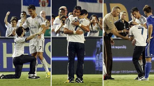 أكدت صحيفة "سبورت" الإسبانية على موقعها الإلكتروني، أمس الجمعة، أن البرتغالي كريستيانو رونالدو نجم نادي ريال مدريد الإسباني قام بلافتة أخلاقية قوية، عندما قرر الدفاع عن شاب قد اقتحم مباراة فريقه مع نادي تشلسي الإنجليزي، وذلك في إطار البطولة الودية التي أقيمت في الولايات المتحدة الأميركية.