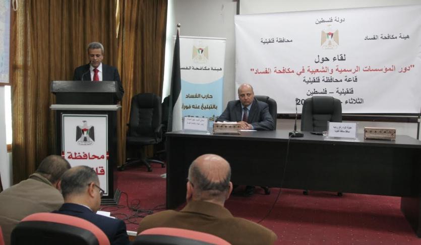 نظمت هيئة مكافحة الفساد بالتعاون مع محافظة قلقيلية، لقاءً مفتوحاً بعنوان " دور المؤسسات الرسمية والشعبية في مكافحة الفساد"،تحت رعاية اللواء رافع رواجبة محافظ محافظة قلقيلية، وذلك في قاعة الشهيد أبو علي اياد في المحافظة.