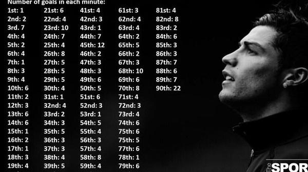 ونشرت الصحيفة إحصائية، تُظهر الدقائق من (1) إلى (90) وعدد الأهداف في كل دقيقة لأفضل لاعب في العالم، وجاءت الدقيقة (45) و(90) كأكثر الدقائق التي سجل فيها أهدافاً (12) و(22) هدفاً على التوالي.