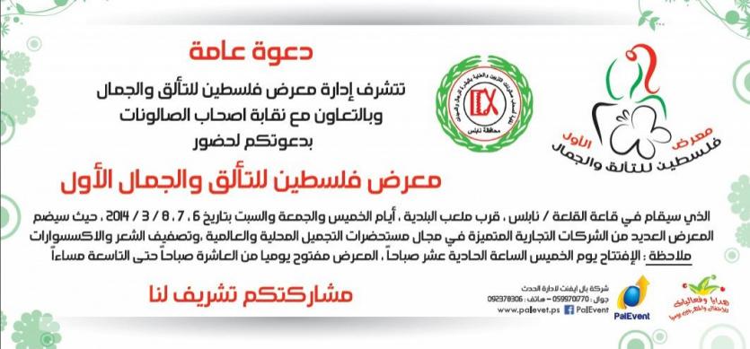 تستعد شركة بال ايفنت لإدارة الحدث وتنظيم المعارض والمناسبات لإطلاق معرض "فلسطين للتألق والجمال" الاول من نوعه في مدينة نابلس، والذي سيقام في قاعة القلعة في الفترة 6_7_8\3\2014.