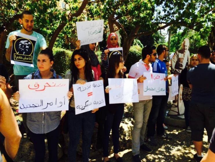 تظاهر اليوم الثلاثاء العشرات من الطلاب العرب في عدة جامعات اسرائيلية داخل الأراضي المحتلة ضد مشاريع تجنيد الشباب العرب للجيش الاسرائيلي.