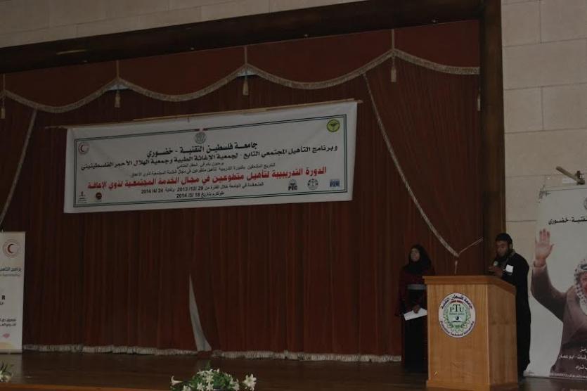 في اطار اهتمام جامعة فلسطين التقنية- خضوري ودورها المتميز في التنمية والخدمة المجتمعية ، أقيم اليوم الأحد، في مسرح الشهيد ياسر عرفات في الجامعة، حفل تخريج الفوج الأول لتأهيل متطوعين للعمل مع الأشخاص ذوي الاحتياجات الخاصة والذي نظمته الجامعة من خلال عمادة التنمية وخدمة المجتمع/ دائرة الدراسات والتنمية المجتمعية وبالتعاون والشراكة مع برنامج التأهيل المجتمعي التابع لكل من: الإغاثة الطبية الفلسطينية وجمعية الهلال الأحمر الفلسطيني، برعاية منتدى شارك الشبابي، غرفة تجارة طولكرم، شركة فلسطين للتأمين، مطبعة ابن خلدون، مكتبة دار الحكمة طولكرم وبمساندة من مستشفى الأمراض النفسية ومؤسسة قرى الأطفال ـ بيت لحم ، جمعية الشبان المسيحية، وجمعية الاتحاد النسائي، جمعية قاقون الخيرية، وجمعية مرضى الثلاسيميا، جمعية دار اليتيم، مركز صعوبات التعلم، جمعية اغاثة أطفال فلسطين، جمعية تأهيل المعاقين وذلك بحضور د. احمد الرمحي- نائب رئيس جامعة فلسطين التقنية -خضوري للشؤون الأكاديمية، و د. نائل سلمان – عمادة التنمية وخدمة المجتمع في جامعة خضوري، و د. محمد عبوشي - مدير برنامج التأهيل المجتمعي، ومدراء وممثلي المؤسسات الرسمية والأهلية والخاصة في محافظة طولكرم، بالإضافة إلى حشد كبير من أعضاء الهيئتين الأكاديمية والإدارية وطلبة جامعة خضوري.