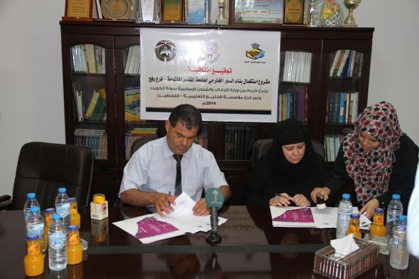 وقعت “القدس المفتوحة” اتفاقية مع مؤسسة الخليج التعليمية شملت استكمال بناء السور الخارجي لفرع الجامعة برفح بتمويل من وزارة الأوقاف والشؤون الإسلامية بدولة الكويت الشقيقة، بتنفيذ من مؤسسة الخليج التعليمية.