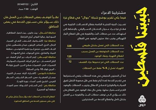 أفادت الشركة في بيان صحفي لها، بأن البنية التحتية الخاصة بقطاع الاتصالات الخلوية في قطاع غزة تضررت جراء عدوان الاحتلال الإسرائيلي واستهداف عددا من محطات البث والتقوية في ظل انقطاع التيار الكهربائي وقرب نفاذ مخزون الوقود في القطاع.