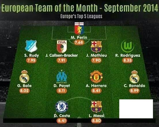 أصدر موقع "Who Scored" الشهير بالاحصائيات التشكيلة المثالية لأفضل 11 لاعباً في الدوريات الأوروبية الكبرى خلال الشهر الماضي، حيث شهدت تواجد أربعة لاعبين من الليغا الاسبانية، كما شهدت تواجد لاعبين من الدوري الانجليزي هما كوستا وأندير هيريرا، وخمسة لاعبين من باقي الدوريات المختلفة.