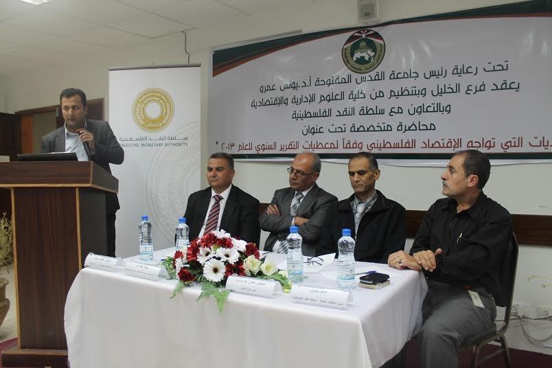 عقد فرع "القدس المفتوحة" في الخليل، بتنظيم من كلية العلوم الإدارية والاقتصادية، وبالتعاون مع سلطة النقد الفلسطينية، محاضرة متخصصة حول "التحديات التي تواجه الاقتصاد الفلسطيني وفقا لمعطيات التقرير السنوي للعام 2013 الصادر عن سلطة النقد الفلسطينية".