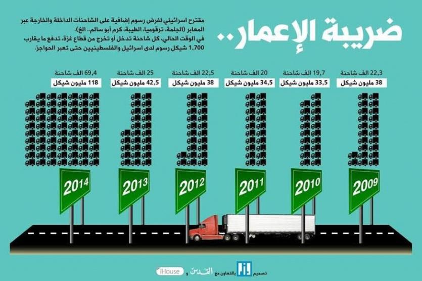 الشاحنات الداخلة إلى قطاع غزة تدفع رسوما تصل إلى نحو 1700 شيقل تقريبا (459) دولارا لكل شاحنة، ما يعني أن الفلسطينيين والمؤسسات الدولية سيكونون مضطرين لدفع نصف مليار دولار عن المواد التي سيتم ادخالها للقطاع لاعادة إعماره (عملية إعادة الاعمار تحتاج إلى 3 ملايين شاحنة).