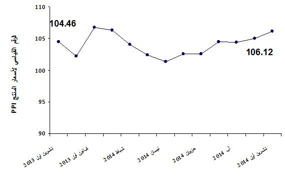 الرقم القياسي العام لأسعار المنتج يسجل ارتفاعاً بنسبة 1.05% خلال شهر تشرين أول 2014 مقارنة مع شهر أيلول 2014، حيث بلغ الرقم القياسي العام 106.12 خلال شهر تشرين أول 2014 مقارنة بـ 105.02 خلال شهر أيلول 2014 (سنة الأساس 2011 = 100).