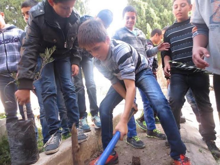 وردد التلاميذ أثناء غرسهم لاشجار الزيتون في حديقة مدرستهم هتافات تدعم المقاطعة مثل "فلسطين بنحبك .. بدنا نقاطع عدوك".