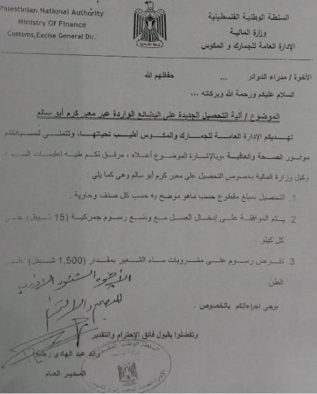 وأوضحت الوثيقة أن ألية تحصيل الرسوم عبر المعبر تتم حسب الكمية التي ستدخل وعددها حيث تترواح قيمتها ما بين 1500شيقل و5000 شيقل كحد اقصى.