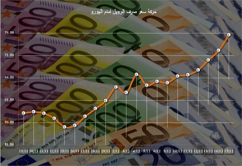 وبحلول الساعة 15:18 بتوقيت موسكو، صعد سعر صرف الدولار أمام الروبل بمقدار 12.80 روبلا ليصل إلى مستوى 77.25 روبلا للدولار الواحد، كما ارتفعت العملة الأوروبية اليورو مقابل الروبل بمقدار 18.12 روبلا لتصل إلى مستوى 97 روبلا لليورو الواحد.