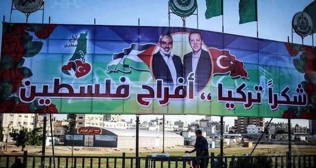 اللافتات يظهر فيها صور للرئيس التركي رجب طيب أردوغان، وإلى جانبه نائب رئيس المكتب السياسي لحركة حماس إسماعيل هنية، بالإضافة لخارطة "فلسطين التاريخية"، وكتب عليها: "شكرًا تركيا ... أفراح فلسطين".