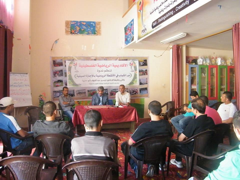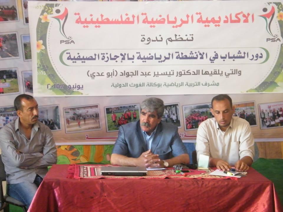 نظمت الأكاديمية الرياضية الفلسطينية ندوة بعنوان دور الشباب في الأنشطة الرياضية وتفاعلهم بالإجازة الصيفية وقد حاضر بالندوة الدكتور تيسير عبد الجواد موجه التربية الرياضية بوكالة الغوث ورئيس الاتحاد الفلسطيني وعضو الاتحاد العربي لكرة اليد السابق