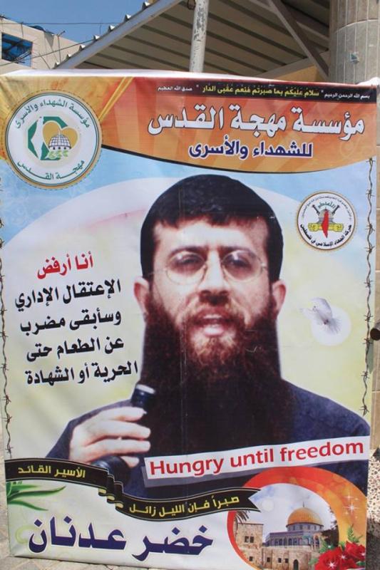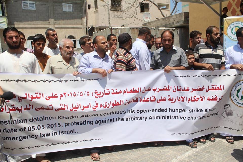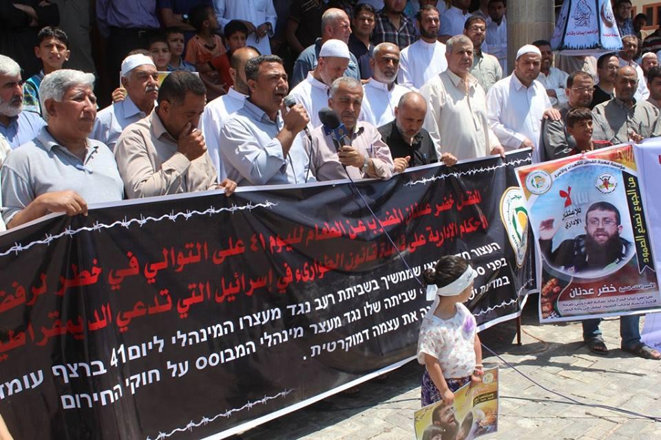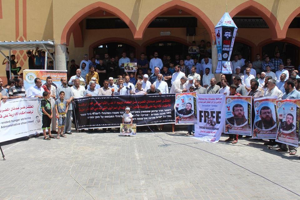 تظاهر عشرات المواطنين ظهر اليوم بعد صلاة الجمعة، في ساحة مسجد انور عزيز بمخيم جباليا شمال قطاع غزة وذلك نصرة للأسير الشيخ خضر عدنان المضرب عن الطعام منذ 53 يوما رفضا للاعتقال الاداري.