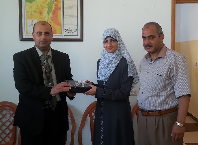 كرم السيد رامي حسين مدير البنك الإسلامي العربي في خانيونس الطالبة المبدعة سجى العثامنة، بمناسبة حصولها على المرتبة الأولى على مستوى فلسطين - الفرع الادبي.