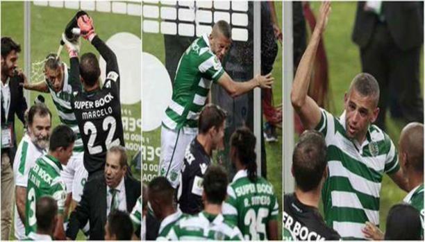 استشاط النجم الجزائري إسلام سليماني غضباً عندما رشه حارس مرمى فريقه سبورتنغ ليشبونة بالشامبانيا وذلك خلال تتويج فريقه بلقب "السوبر" البرتغالي بعد الفوز على بنفيكا بنتيجة 1-0.