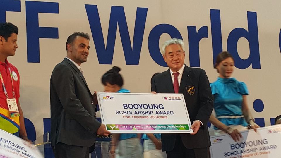 كُرم الاتحاد الفلسطيني ممثلا برئيس الاتحاد الدولي وأسرة التايكواندو في جمهورية كوريا الجنوبية في حفل افتتاح بطولة العالم الثاني للاشبال بحضور رسمي رفيع، بمنحة بقيمة 5000 دولار استلمها رئيس الاتحاد.