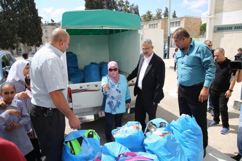 سلم محافظ طولكرم عصام أبو بكر مكرمة رئاسية (شنط مدرسية) لطلاب المدارس في مخيمي طولكرم ونور شمس وذلك بحضور مسؤول ملف المساعدات الإنسانية في مكتب الرئيس اللواء رائدة الفارس.