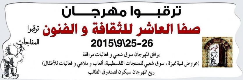 تنطلق فعاليات مهرجان صفا العاشر للثقافة والفنون في السادس والعشرين من الشهر الجاري الذي يوافق ثالث أيام عيد الاضحى المبارك، ويستمر مدة يومين (26-27/9/2015).