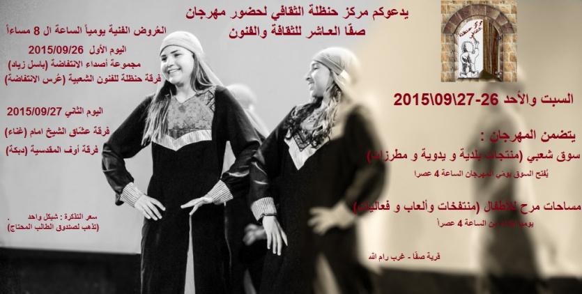 انهى مركز حنظلة الثقافي (قرية صفا)، تحضيراته لتنظيم مهرجان صفا العاشر للثقافة والفنون، حيث تستعد القرية لاستقبال الحضور، حيث من المتوقع حضور المهرجان ما يزيد عن عشرة الاف نسمة من القرية ومن خارجها، ويدعو مركز حنظلة الجماهير الى المشاركة في المهرجان وحضوره، حيث يحمل المهرجان هذا العام اسم (عرس الانتفاضة)، كون المهرجان يأتي سنويا في اطار احياء ذكرى استشهاد الفنان الفلسطيني ناجي العلي الذي طالما دعا بدوره الى الثورة والانتفاضة.