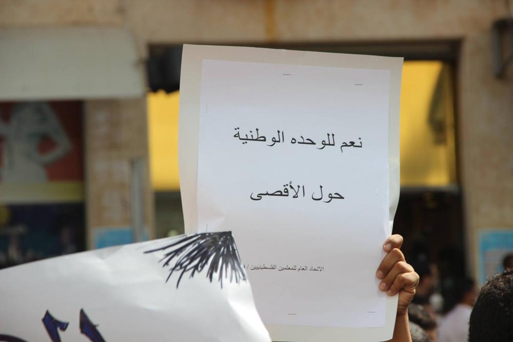 وأكد المعلم عنان دعنا "نحن اعتدنا أن يكون المعلمين في الصف الاول للدفاع عن الاقصى، لذلك نحن اليوم نقف لنؤكد على عروبة واسلامية الاقصى والمقدسات، ونحن نطالب المؤسسات الحكومية وغيرها بالوقوف أمام هذه السياسات الاحتلالية. ونحن وقفنا لنقول لا وألف لا للتهويد الزماني والمكاني للمسجد الاقصى كما حصل مع المسجد الابراهيمي".