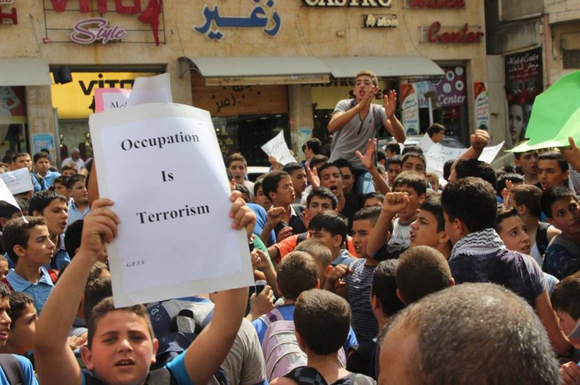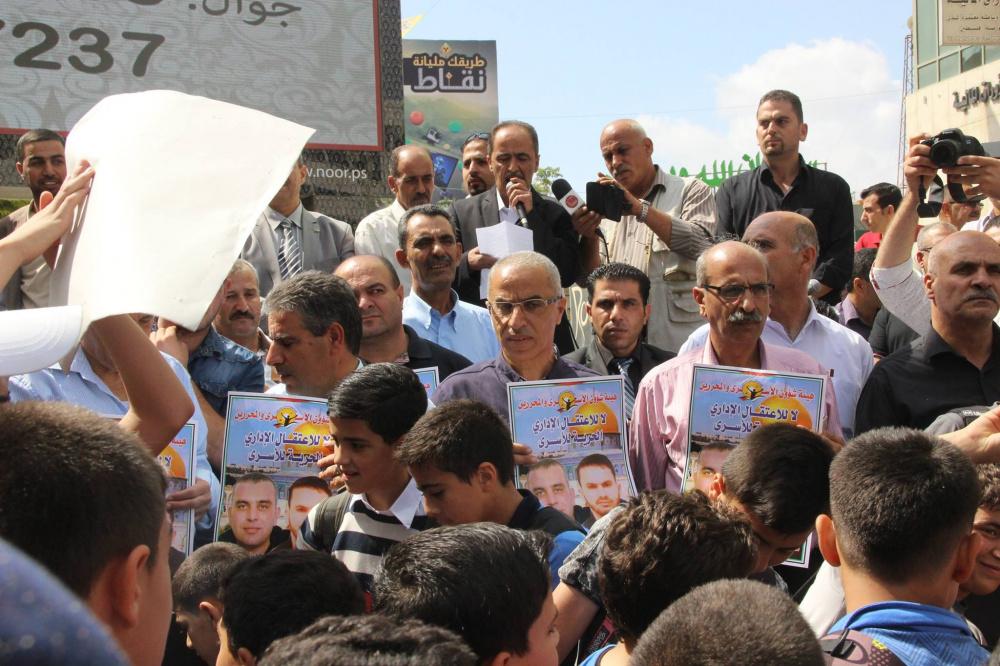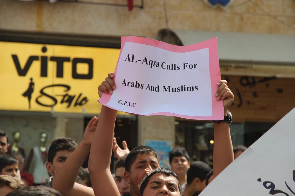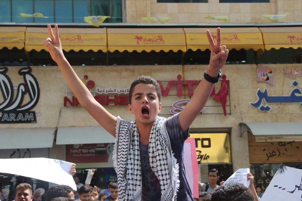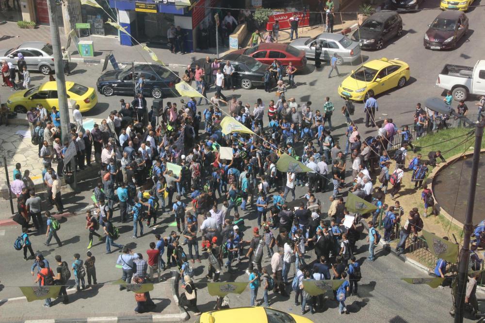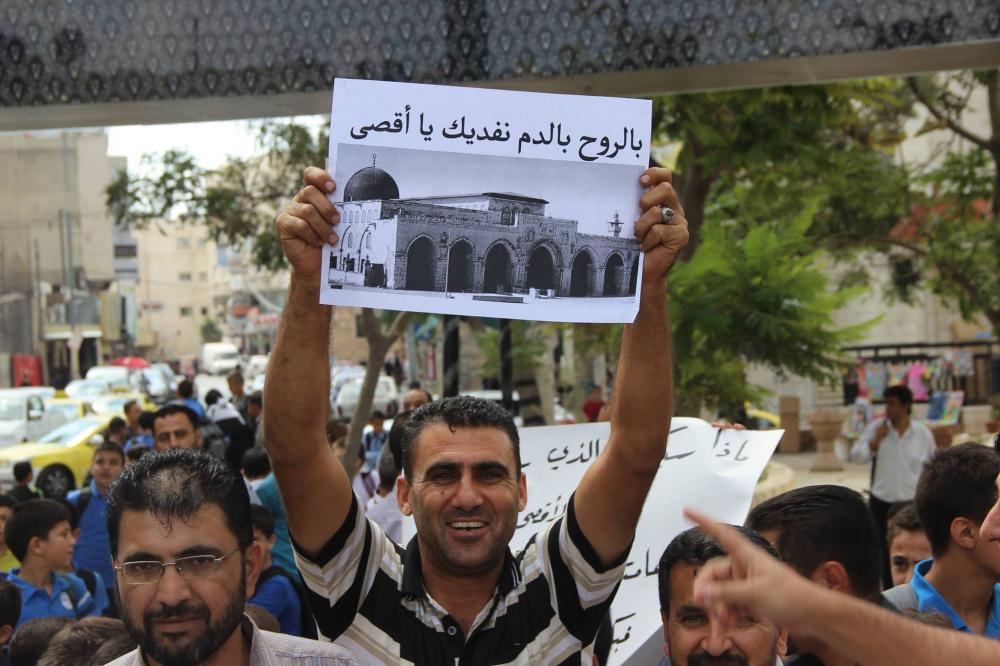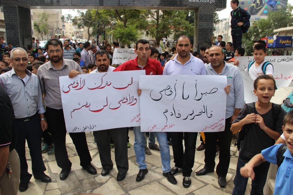 اعتصم المئات من المعلمين وطلبتهم، رفضا لما يتعرض له المسجد الأقصى من اعتداءات، اليوم الاثنين، على دوار ابن رشد وسط الخليل.