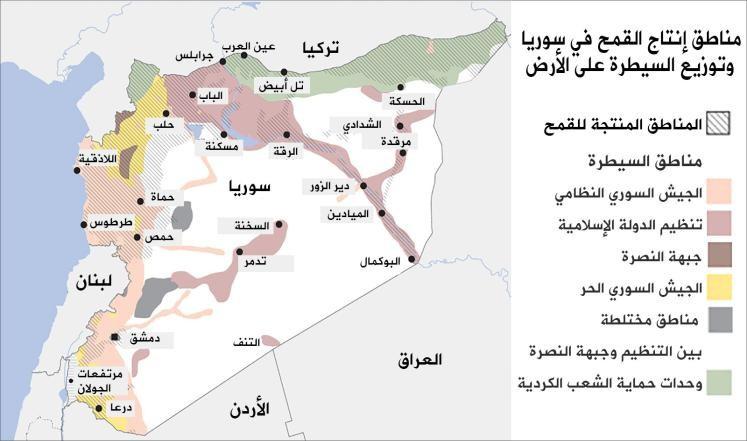 وقد فقد نظام الرئيس السوري بشار الأسد السيطرة على الكثير من المناطق الرئيسية لإنتاج القمح لفائدة قوات المعارضة وتنظيم الدولة الإسلامية، إذ يسيطر الأخير على محافظتي الرقة ودير الزور اللتين تعتبران سلة غذاء سوريا، في حين أن محافظة الحسكة في الشمال الشرقي حيث الأراضي الصالحة للزراعة تخضع إلى حد كبير لسيطرة إدارة كردية ذاتية.