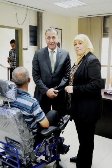 سلمت محافظ محافظة رام الله والبيرة د.ليلى غنام والمدير الإقليمي للبنك التجاري الأردني لفروع فلسطين السيد منتصر الششتري، مواطناً من ذوي الإحتياجات الخاصة كرسياً كهربائياً متحركاً في إطار دعم الفئات الأقل حظاً بالمجتمع".