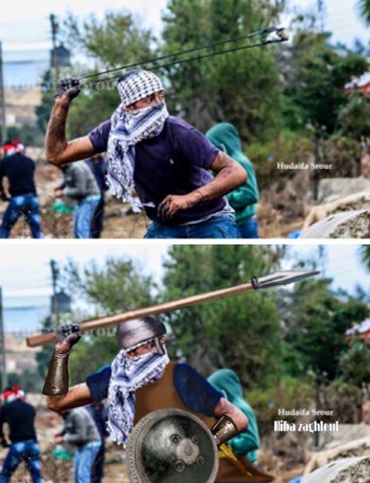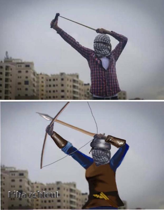 اما عن رسمة الشاب المقاوم وهويرتدي الخوذة وفي اسفلها الكوفية الفلسطينيه وويحمل الدرع والسيف والسهم توضح زغلول انها حاولت ربط التاريخ القديم بجيل الحاضر خوذة ودرع وسيف وسهم حملوها أسلافنا وصلاح الدين الأيوبي في القدم لمقاتلة الأعداء لتحرير القدس الشريف