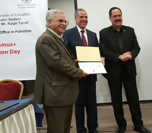 هذا وقد تم تكريم جميع الجامعات الفلسطينية الفائزة في مشاريع (Erasmus +) خلال العام 2015 برعاية معالي د. صبري صيدم / وزير التربية والتعليم العالي وبحضور ممثل الاتحاد الأوروبي السيد رالف تراف ومدير مشاريع (Erasmus +) في فلسطين د. نضال الجيوسي.