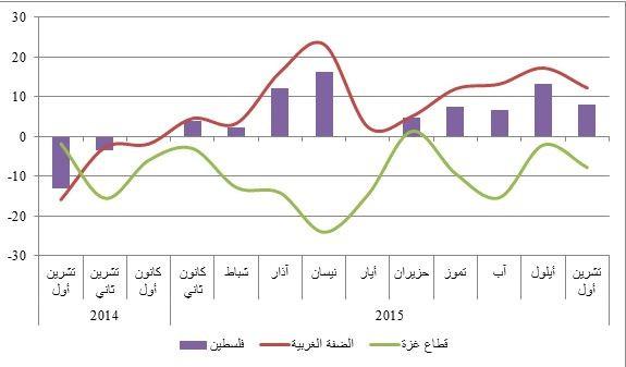 ففي الضفة الغربية، تراجعت جميع الأنشطة الصناعية المكوّنة للمؤشر، باستثناء ثبات نسبي في مؤشري صناعة الغذاء والصناعات التقليدية. وجاء أبرز التراجع من نصيب صناعة الأنسجة التي تراجع مؤشرها بشكل واضح من 2.2 نقطة إلى نحو -11.2 نقطة بين شهري تشرين أول وتشرين ثاني. تلاه التراجع في نشاط الإنشاءات من 2.0 نقطة إلى -2.5 نقطة خلال الفترة موضوع الحديث. وفي المحصلة، هوى مؤشر الضفة الغربية بشكل واسعإلى أدنى مستوى له منذ نحو العام (-20.3نقطة)،مقارنة بمستويات متوسطة خلال تشرين أول الماضي عند مستوى12.2 نقطة.