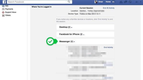 وعلى الحاسب يمكن له من خيار Where You’re Logged In أن يذهب إلى تبويب Messenger ليجد أمامه قائمة بالجلسات المفتوحة والتي يتم بها استخدام هذه الخدمة من فيسبوك، وعليه حينها إنهاء الجلسة الخاصة بجهاز iOS بالنقر على خيار End Activity، ومن ثم سيجد أنه تم تسجيل خروجه من التطبيق وعليه تسجيل الدخول من جديد.