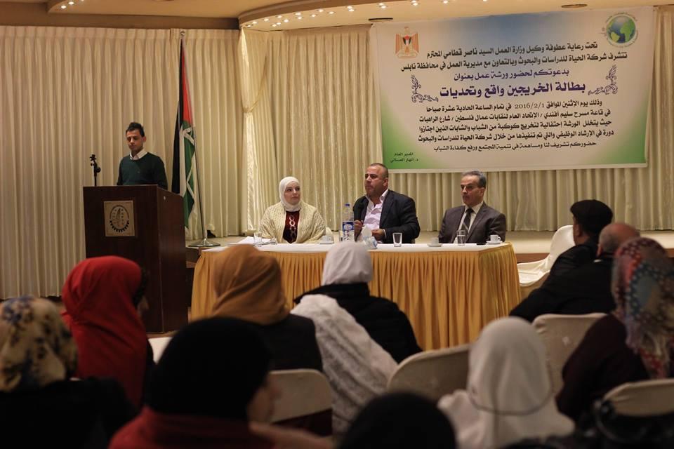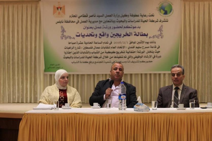 نظمت شركة الحياة للدراسات والبحوث، بالتعاون مع مديرية العمل في محافظة نابلس ورشة عمل بعنوان "بطالة الخريجين واقعٌ وتحديات"اليوم الإثنين، في مدينة نابلس.