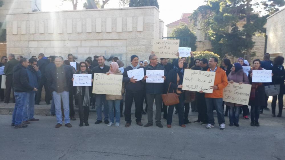 ورفع المعتصمون يافطات تدعو مجلس أمناء المدرسة بوضع خطط أكاديمية وسياسات مالية واضحة، وتطبيق المبادئ والقيم التي تقوم عليها رسالة المدرسة.