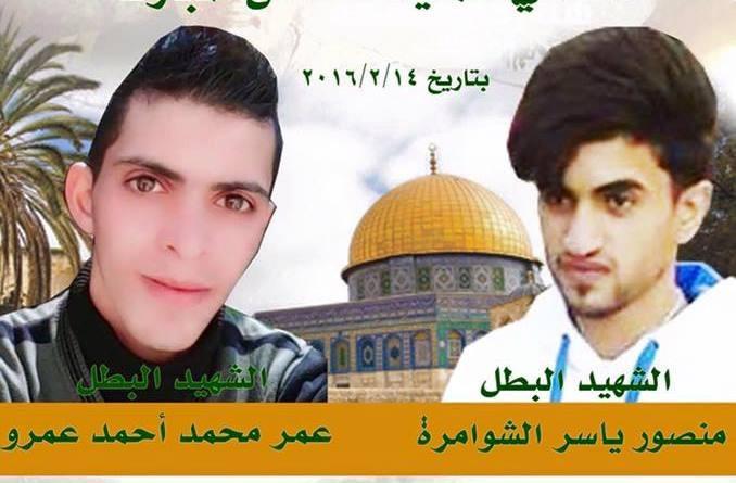وقالت مراسلتنا في القدس ان الشهيدان هم عمر محمد أحمد عمرو (احد أفراد الأمن الوطني) ومنصور ياسر شوامرة وهما من قرية القبيبة شمالي غربي القدس.
