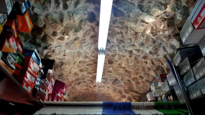 وبالدخول الي المحل تختلف الصورة تماما، الى الأعلى سقف تاريخي بحجارة بارزة كما لو انها سلاسل حجر معلقة ومتماسكة في الاعلى ككتلة واحدة، تغطي السقف كله.