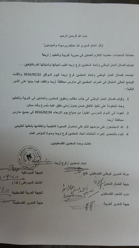 اتفقت فصائل العمل الوطني واتحاد المعلمين في محافظة اريحا والأغو يتفقان العودة الى الدوام المدرسي صباح الاربعاء القادم في جميع مدارس المحافظة.