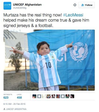 وقال الحساب الرسمي لليونيسيف في أفغانستان «مرتضى لديه شيء حقيقي الآن، ساعدناه لتحقيق حلمه، حصل على قميص موقع وكرة قدم».