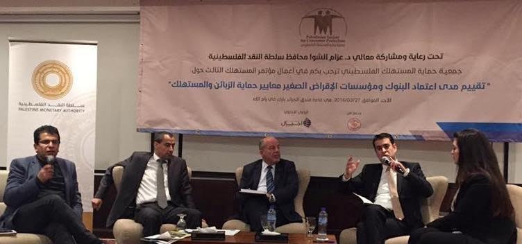 عقدت جمعية حماية المستهلك الفلسطيني، بمدينة رام الله، اليوم، أعمال المؤتمر الثالث للمستهلك الفلسطيني، تحت عنوان: "تقييم مدى اعتماد البنوك ومؤسسات الاقراض الصغير معايير حماية الزبائن والمستهلك"، بمشاركة محافظ سلطة النقد، عزام الشوا، ومصرفيين ومختصين وأكاديميين دعوا خلالها إلى ضرورة مراجعة أسعار الفائدة في فلسطين، والبحث عن السبل الرامية إلى تخفيضها سواء من قبل المصارف أو مؤسسات الإقراض الصغير.