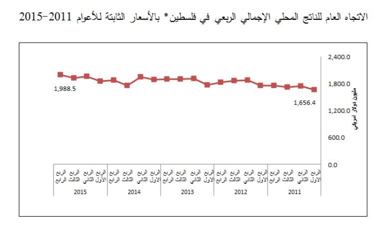أشارت التقديرات الأولية بالأسعار الثابتة إلى ارتفاع الناتج المحلي الإجمالي لفلسطين، خلال الربع الرابع من عام 2015 بنسبة 6.1% بالمقارنة مع الربع الرابع من العام 2014، حيث سجل ارتفاعاً بنسبة 1.0% في الضفة الغربية، وارتفاعاً بنسبة 24.7% في قطاع غزة وذلك مقارنة مع الربع الرابع 2014 والذي أعقب العدوان على قطاع غزة. وسجل ارتفاعاً بنسبة 3.5% مقارنة مع الربع الثالث من العام 2015 بالأسعار الثابتة، علماً أن سنة الأساس 2004.