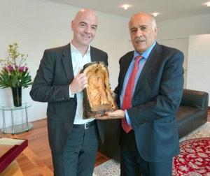 وجدد انفانتينو دعم الفيفا لفلسطين، ومواصلة تنفيذ برامج التطوير بالتعاون مع الاتحاد الفلسطيني، الى جانب أهمية تنفيذ برامج لها علاقة بالنهوض بالجوانب الفنية والادارية بالاتحاد الفلسطيني للعبة.