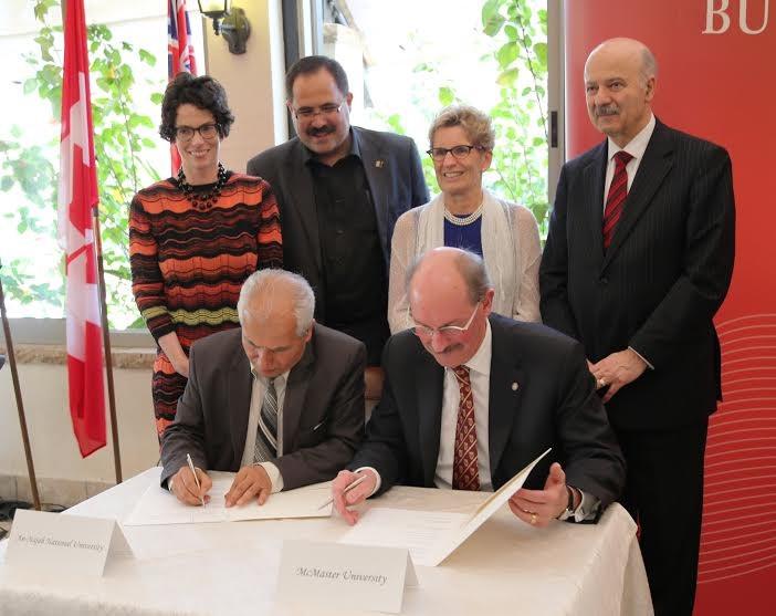 جرت في مدينة رام الله، اليوم، مراسم توقيع اتفاقية شراكة وتعاون بين الجامعات الفلسطينية: النجاح وبير زيت وبيت لحم، ونظيراتها الكندية: ماك ماستر، ويورك، وويندسور، برعاية ومشاركة وزير التربية والتعليم العالي د. صبري صيدم، ورئيسة وزراء مقاطعة اونتاريو الكندية كاثلين وين.