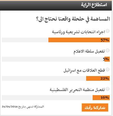 اتفق اكثر من نصف المبحوثين وتحديدا (57%) منهم، مع خيار اجراء انتخابات بلدية وتشريعية ورئاسية، في حين طالب 22% فقط من المبحوثين قطع العلاقات مع اسرائيل ، و16% طالبوا بتفعيل منظمة التحرير الفلسطينية، ولم يجد خيار تفعيل سلطة الاعلام سوى 5% من المؤيدين بين المستطلعة اراؤهم.