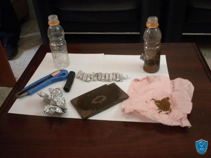وذكر بيان إدارة العلاقات العامة والإعلام في الشرطة أن الشرطة تلقت معلومات تفيد بوجود شخصين في منزل بإحدى قرى غرب رام الله يشتبه حيازتهما وترويج المخدرات في البلدة، وعلى الفور تحركت قوة من شرطة مكافحة المخدرات تساندها الشرطة الخاصة الى المنزل وبناءً على مذكرة من النيابة العامة تم تفتيش المنزل والقاء القبض على المشتبه بهما صاحب المنزل وصديقه من ذوي السوابق وضبطت الشرطة بحوزتهما كمية قليلة من مادة بنية اللون يشتبه ان تكون مادة الحشيش المخدرة بالاضافة الى كمية قليلة من تبغ مخلوط بمادة بنية اللون يشتبه ان تكون مادة الحشيش المخدرة وادوات من نوع "بانج"عدد 2 تستخدم للتعاطي.