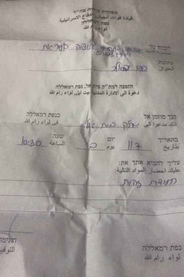 وكتب في البلاغ بكلمات عربية واخرى عبرية، "حضرة السيد: جهاد محمد توفيق بعيرات" ...انك مدعو الى ....في لواء رام الله، بتاريخ 11-7 بتمام الساعة 10:30".